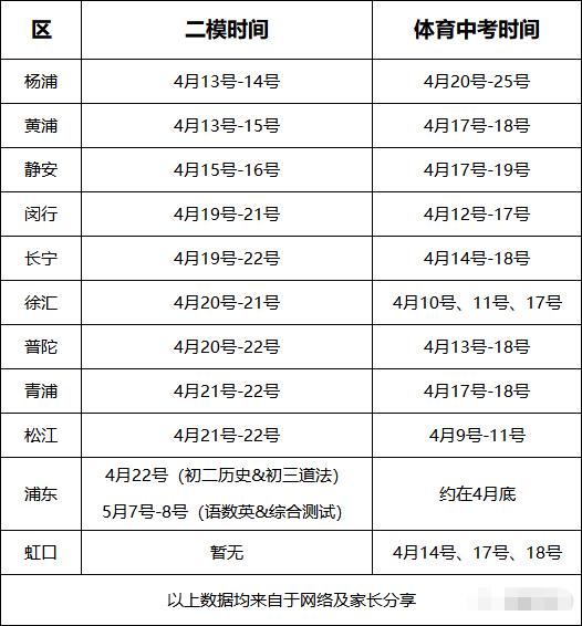 上海各区<二模、体考>时间出炉! 2021/3/23 10:21:13 上海中考网 人气: 标签:上海各区<二模 体考>时间 3月接近尾声,对于初三学生来说,二模考和体育考试越来越近了。 今天跟大家分享部分区二模考试时间及中考体育考试时间,信息来源于学生、家长分享,供大家参考!