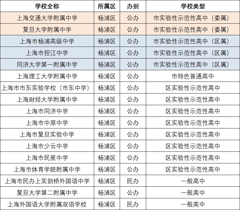 控江中学(八大之一)、杨浦高级中学、同济大学第一附属中学
