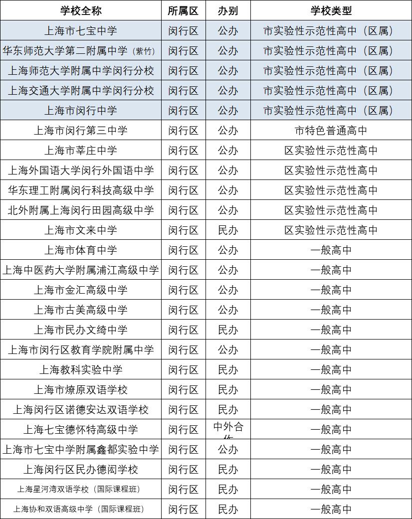 七宝中学(八大之一)、闵行中学、上师大附中闵行分校、华二紫竹、交大附中闵行分校