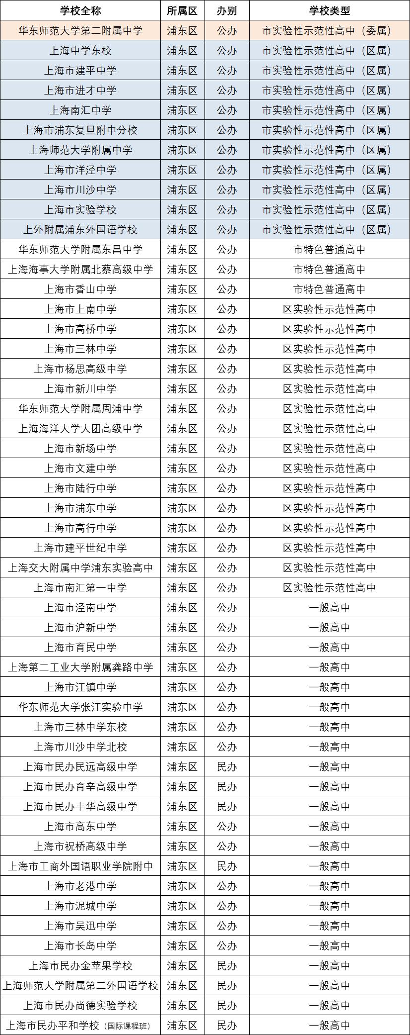 建平中学(八大之一)、进才中学、洋泾中学、川沙中学、南汇中学、上师大附中、上海实验学校、复旦附中浦东分校、上中东校、上外浦外
