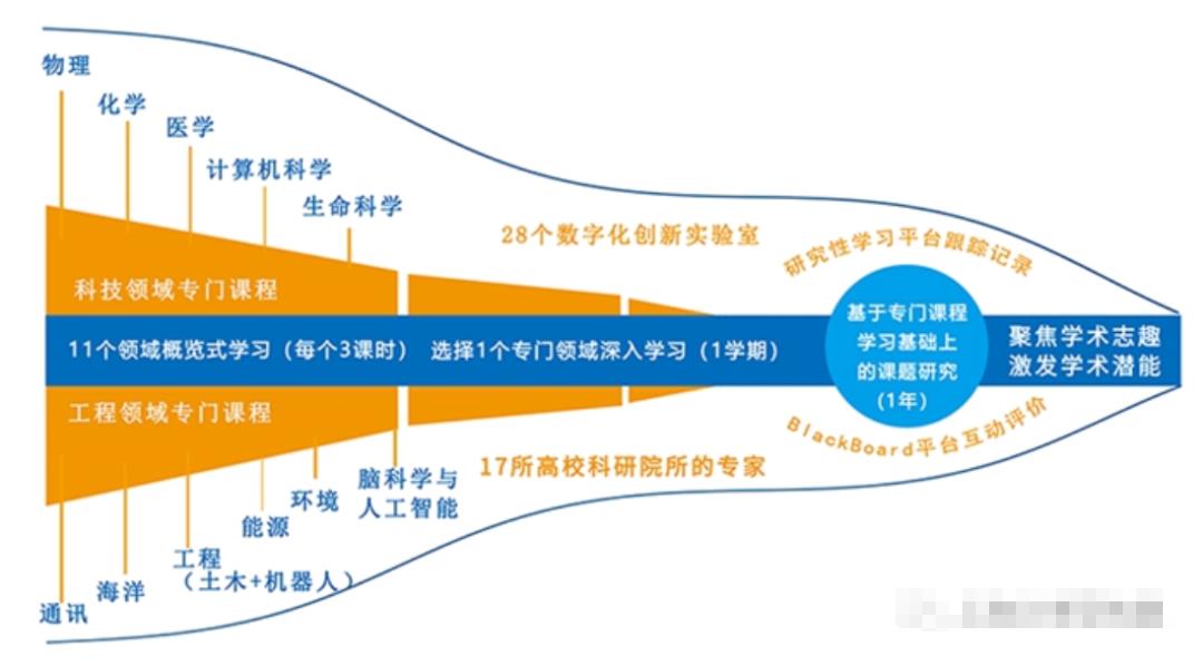 科技班和工程班的学生先进行11个方向的概览式学习(每个方向学习3个课时),在了解这些领域的基础上,再选择一个专门领域进行学习(共1学期),然后引导学生对该专门课程进行课题研究(为期1年)。