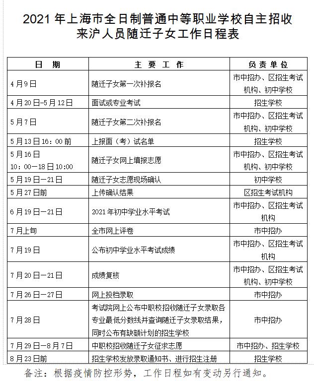 2021上海中考日程表<查分、分数线公布、录取时间都有> 2021/4/15 11:49:02 上海中考网 人气: 标签:中考 2021年上海初中毕业统一学业考试时间安排 2021年上海市高中阶段学校考试招生工作日程表 2021中等职业学校提前批招生工作实施日程表 2021全日制普通中等职业学校自主招收来沪人员随迁子女工作日程表