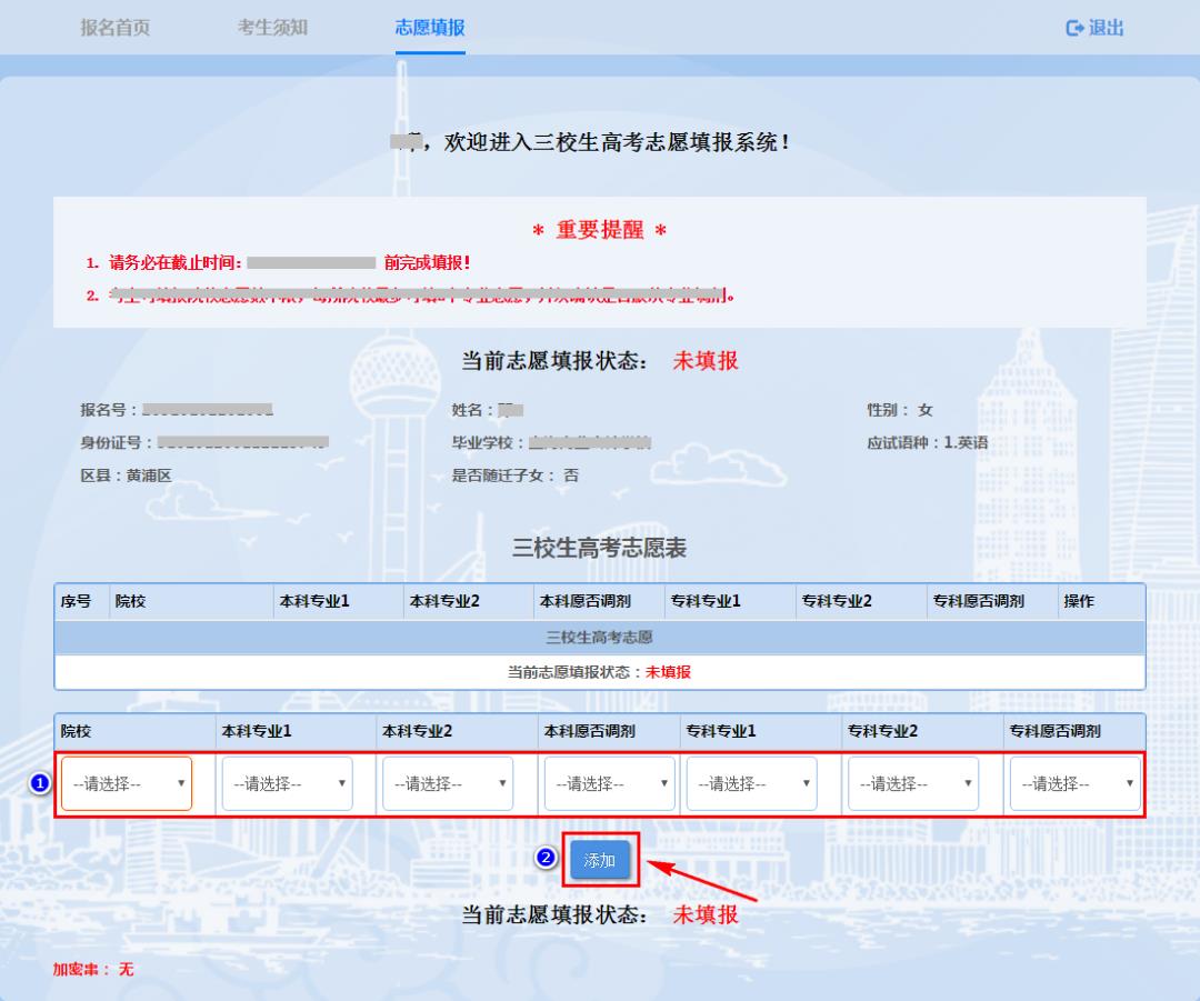 7.下拉框中显示所有招生院校、专业,选择意向院校和专业后,选择愿否专业调剂,点击“添加”按钮。