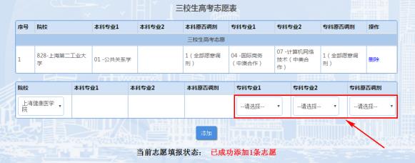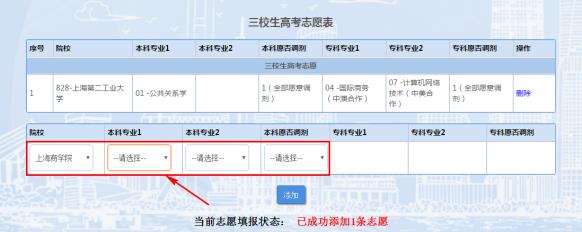 8.界面显示红色“已成功添加1条志愿”,表示该条志愿填报成功。如下图所示(图片内容仅供参考):