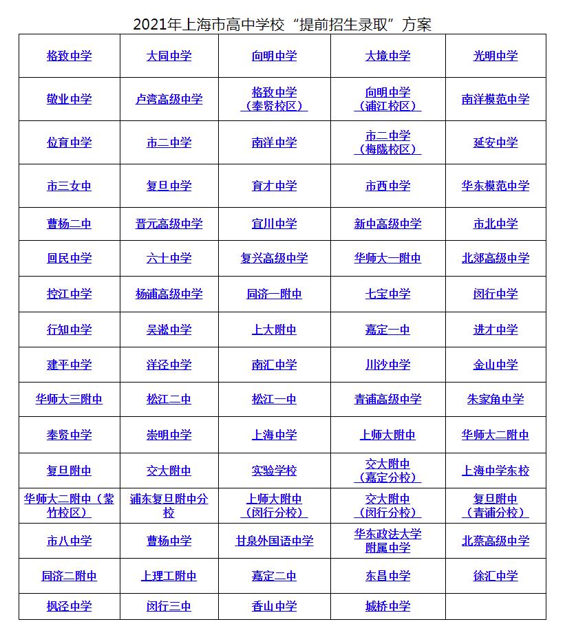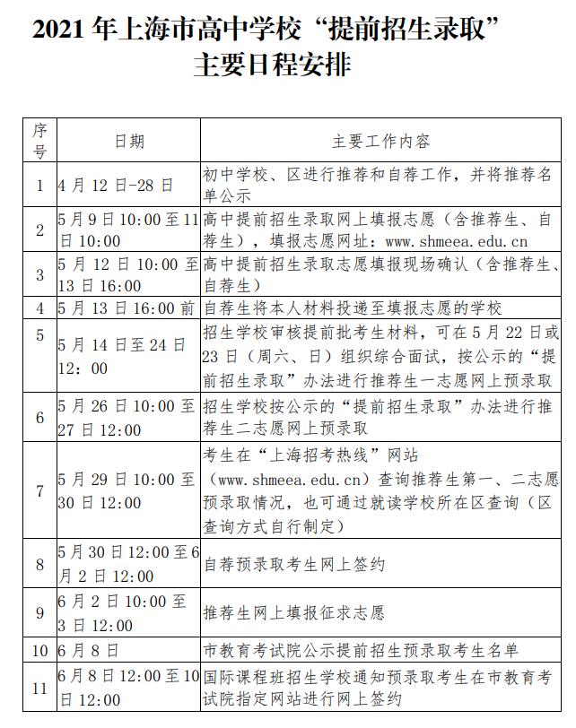 今年本市共有79所高中学校(含分校或校区)进行“提前招生录取”工作,根据《上海市教育委员会关于转发〈上海市教育考试院关于2021年本市中等学校高中阶段考试招生工作的实施意见〉的通知》的要求,凡符合“提前招生录取”资格的考生,须于5月9日(星期日)10:00至5月11日(星期二)10:00登录上海市教育考试院“上海招考热线”网站(www.shmeea.edu.cn)填报志愿,并于5月12日(星期三)10:00至5月13日(星期四)16:00对网上填报的志愿进行现场书面志愿确认(本市应届初三学生在就读初中学校进行确认,应届返沪考生到报考区招考机构进行确认)。