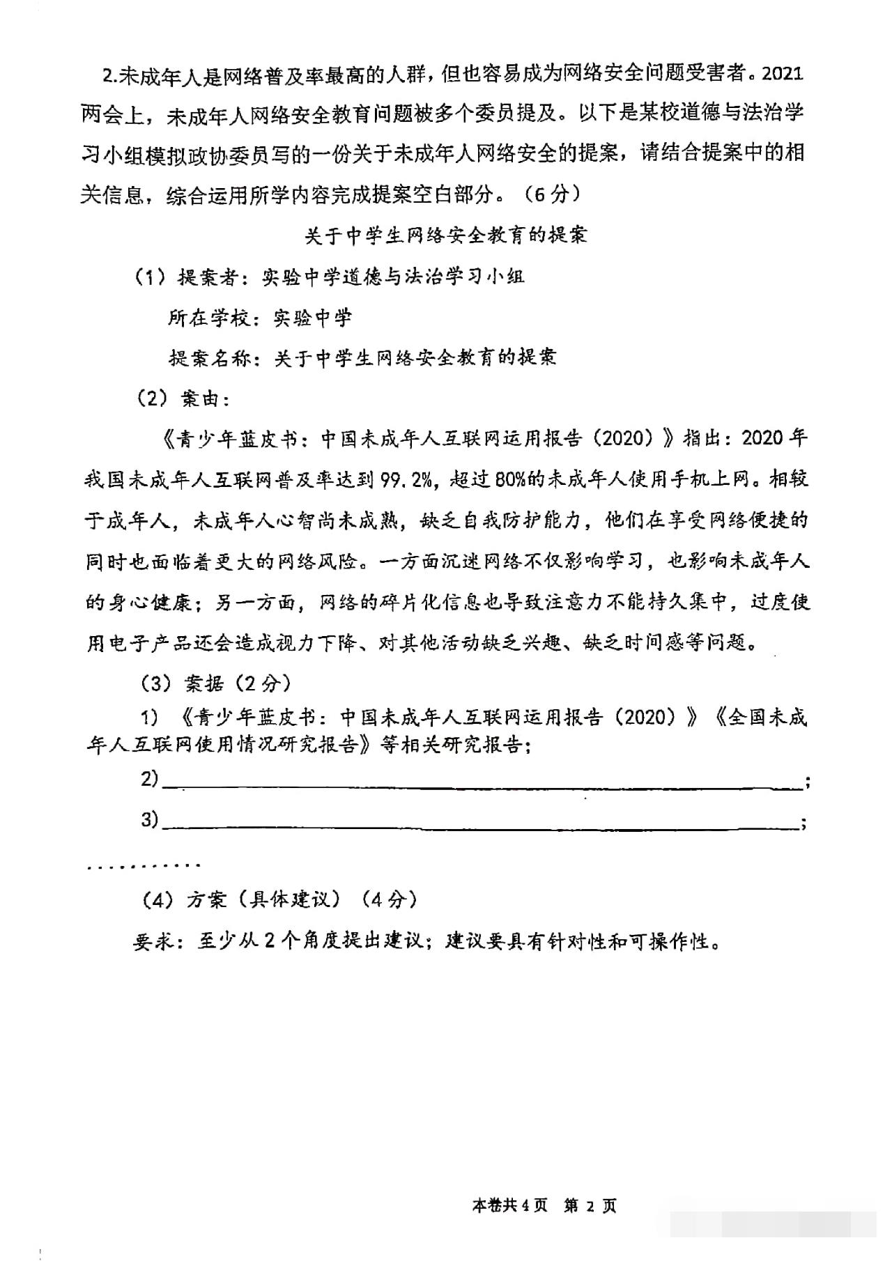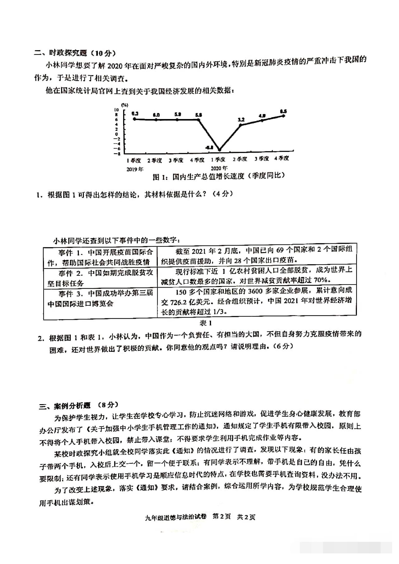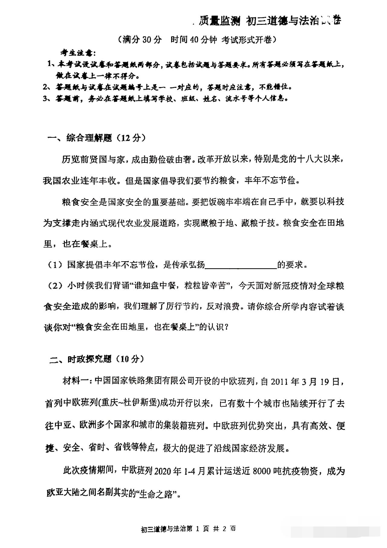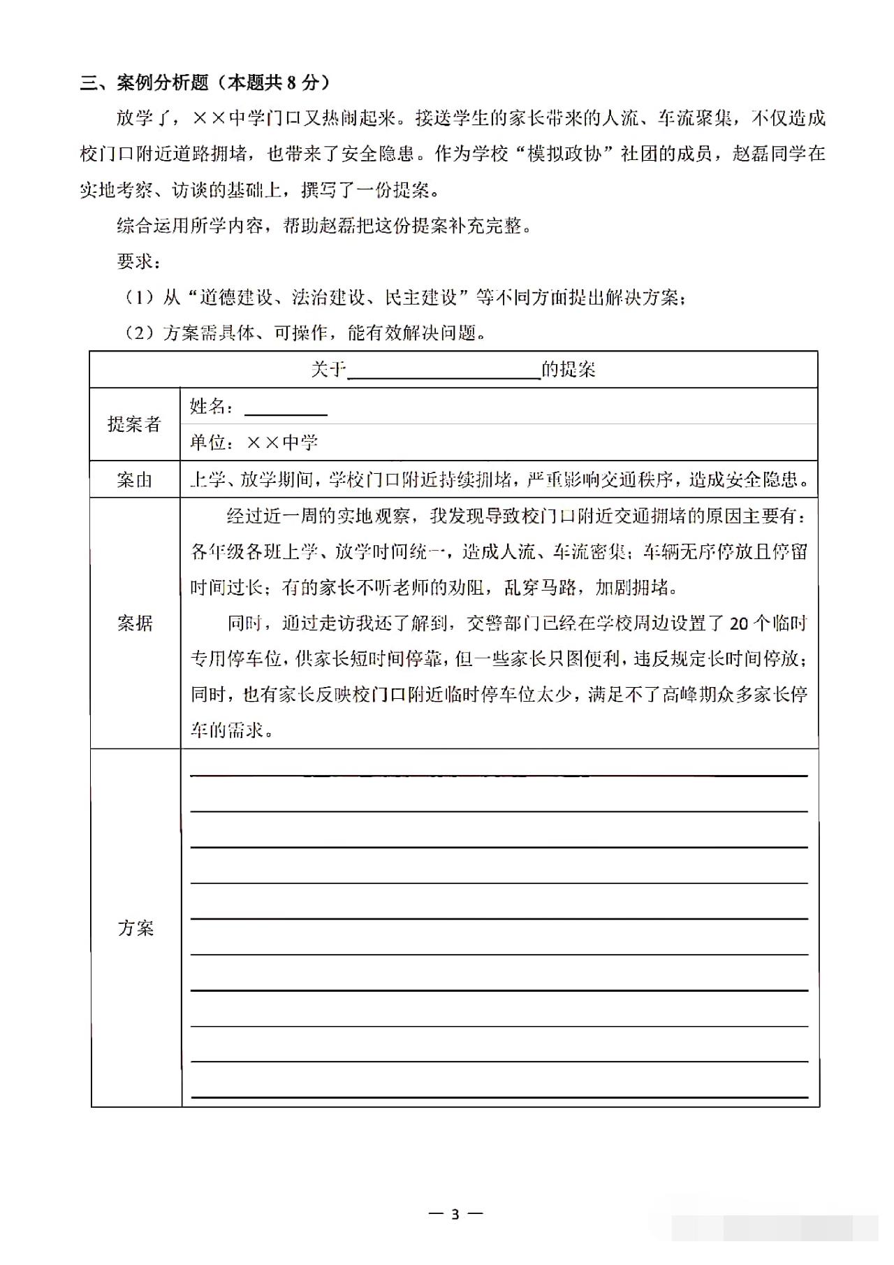 从卷面上看,全卷共有三道综合题,分别为综合理解题、时政探究题和案例分析题,满分30分。
