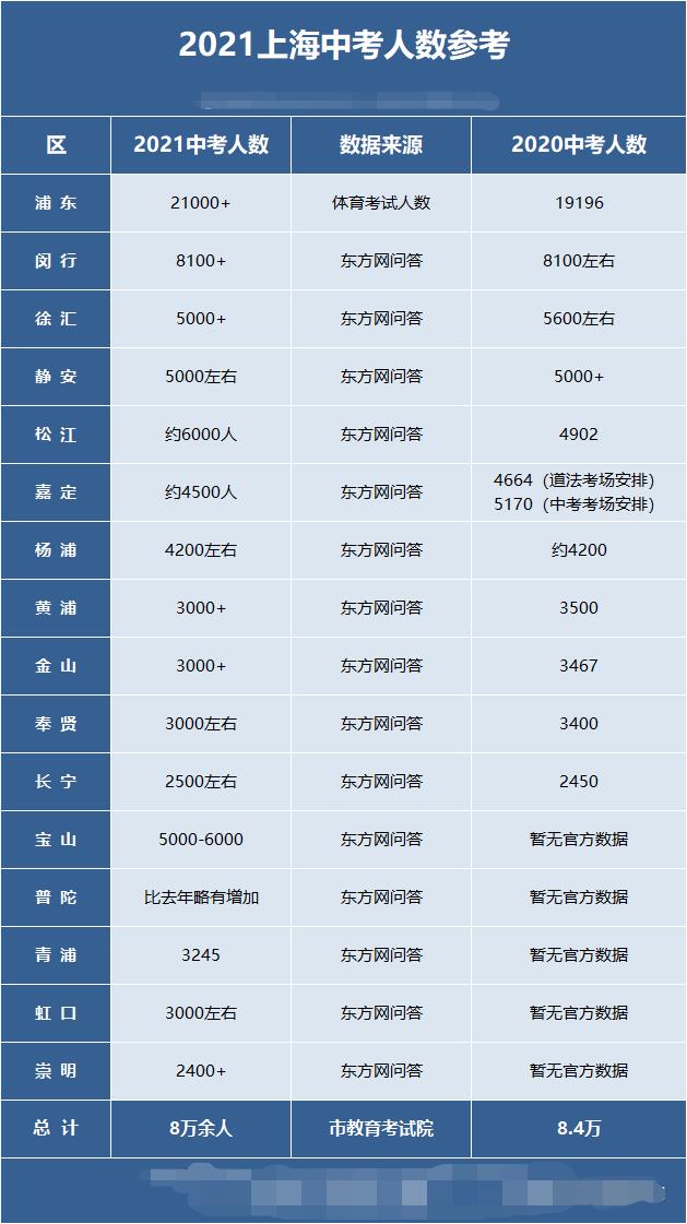 2021年上海各区中考人数出炉!浦东超2万人! 2021/4/27 13:51:41 上海中考网 人气: 标签:中考 2021上海各区中考人数统计 附上2016-2021年上海中考人数统计图: 2016-2019年上海中考人数比较稳定,一直保持在7万多人,分别为7.51万、7.4万、7.03万、7.2万。2020年则是迎来猛增,达到8.4万人。 2021年上海中考人数,官方公布为8万余人,再次突破8万大关。不过相比2020年有所减少,约4000人。