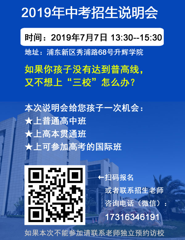 备注:限上海户籍;中考成绩400分以上,参加本校自主招生考试中考成绩作为参考、满30人开班。