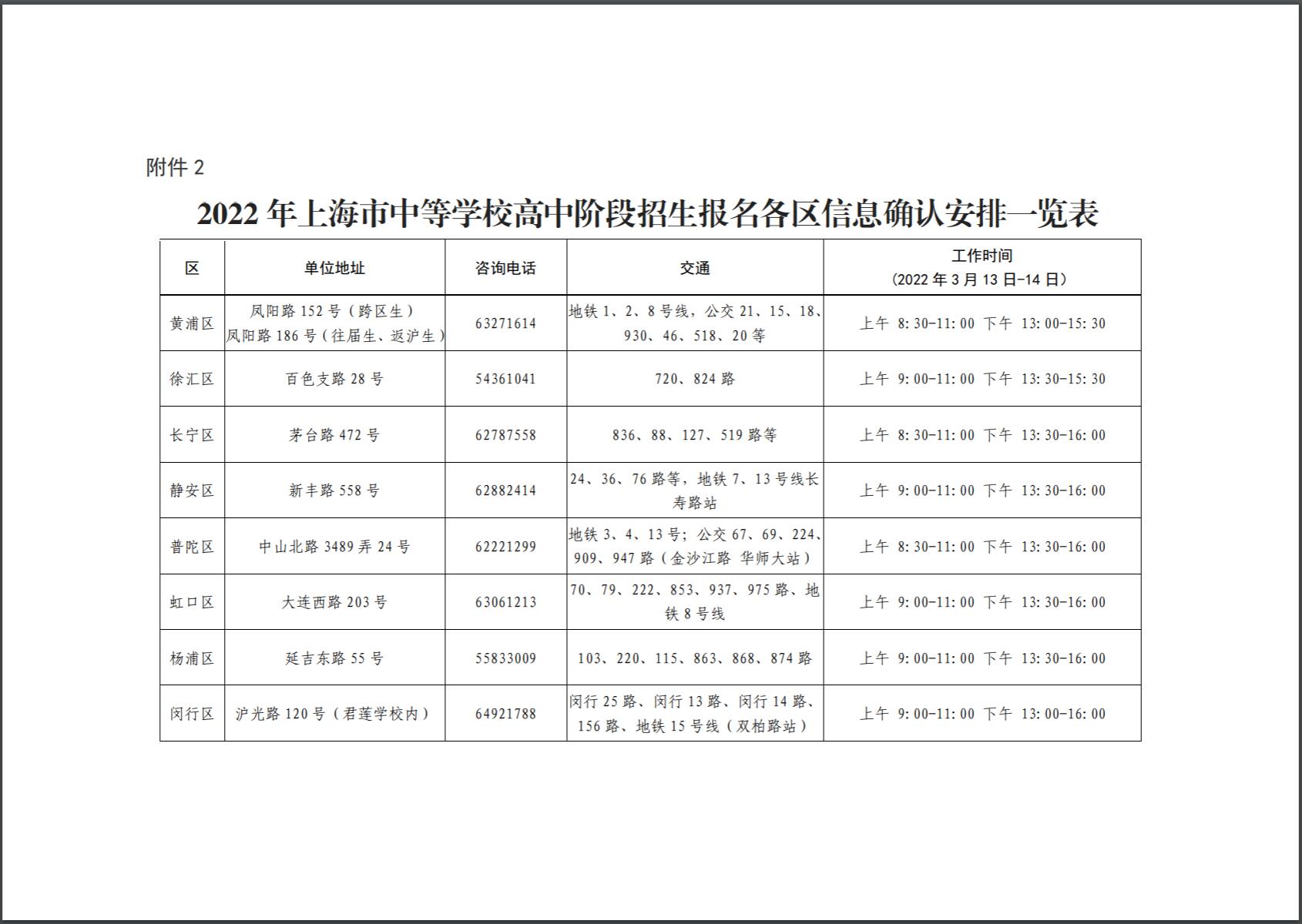 2022年上海市中等学校高中阶段招生报名各区信息确认安排一览表