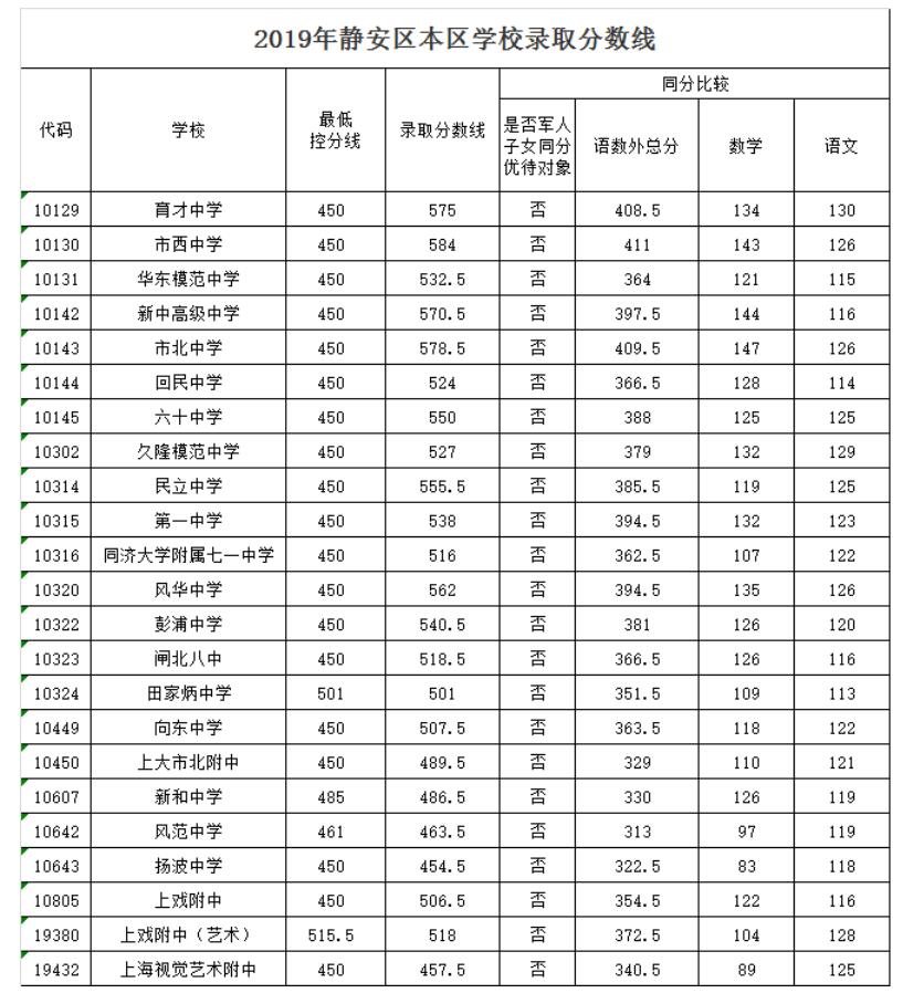 2019年静安区本区学校录取分数线