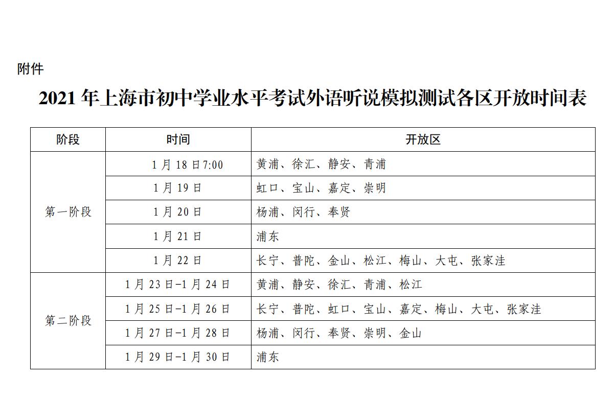 1. 线上模拟练习:2021年1月18日至30日期间,学生可按照《2021年上海市初中学业水平考试外语听说模拟测试各区开放时间表》(见附件)中规定的时间段,登录2021年上海市初中学业水平考试外语听说测试模拟练习平台(以下简称“练习平台”)进行模拟练习。通过练习平台, 熟悉考试环境和流程,熟练掌握作答方式,为正式考试做好准备。访问地址: