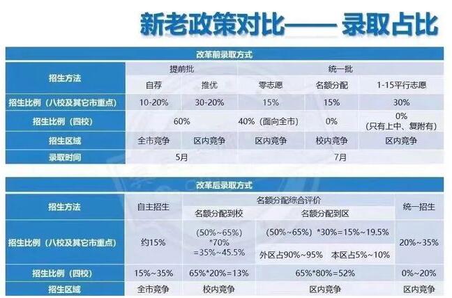 高中政策方面,原先中考的自荐、推荐、零志愿、名额分配和1-15志愿变化为自主招生,名额分配评价综合录取和统一招生录取。